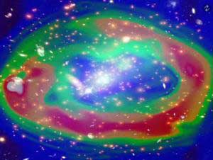 不過,有一個事實(shí)是確定無疑的:大自然已經(jīng)將星系團(tuán)轉(zhuǎn)變成了一個強(qiáng)大的粒子加速器,其功能要比目前歐洲粒子物理研究所的巨大核強(qiáng)子碰撞器強(qiáng)大20倍。研究組成員斯蒂芬-帕爾塔尼說:“當(dāng)然,與之相比,蛇夫座星系團(tuán)要大得多,巨大核強(qiáng)子碰撞器的直徑是27公里,而蛇夫座星系團(tuán)的直徑有200萬光年。”目前世界上功能最強(qiáng)大的人造核粒子加速器位于歐洲粒子物理研究所在瑞士粒子物理實(shí)驗(yàn)室創(chuàng)建的“巨大核強(qiáng)子碰撞器”。正如恒星與行星起源于松散的塵埃和氣體云團(tuán)一樣,星系也是起源于大得多的凝結(jié)塊。當(dāng)星系在空間移動時(shí),自身巨大的引力將持續(xù)拖動環(huán)繞周圍的塵埃及氣體云。當(dāng)它們發(fā)生碰撞或凝結(jié)成團(tuán)時(shí),產(chǎn)生的巨大能量將壓縮和加熱云團(tuán)。