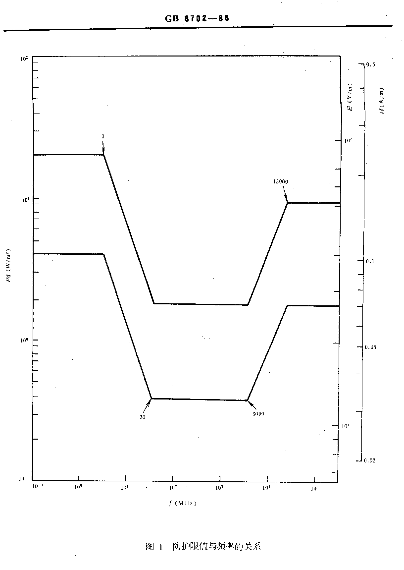 1.3 本規定中防護限值的適用頻率范圍為 100 k Hz~ 300 GHz。防護限值與頻率的關系見下圖。